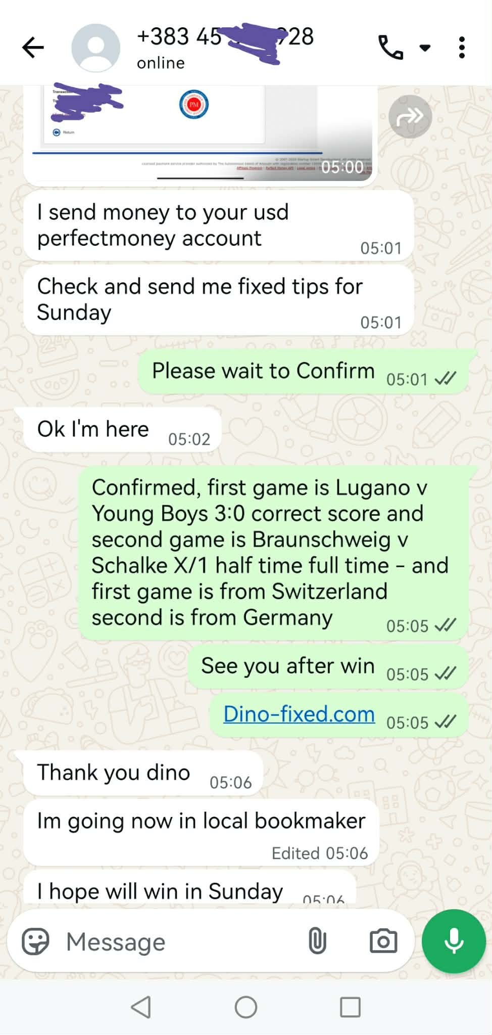 Screenshot from WhatsApp Conversation who receive fixed matches info